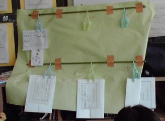 ◆相互評価や意見の交流を行わせる際、支柱にクリップや洗濯ばさみなどの留め具を取り付けた作品展示のための道具を作成して、パンフレットなど、表(おもて)も裏も見せたいような作品を展示する時や、必要に応じて貼り替えを行なうことが必要なときに使いました。