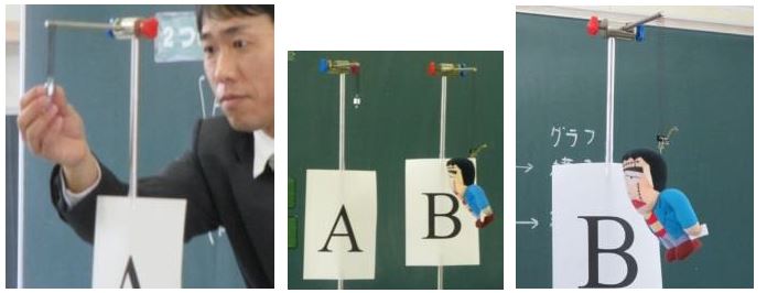 【事象B】おもりより大きい人形をばねにつるす。 |  | | |  |