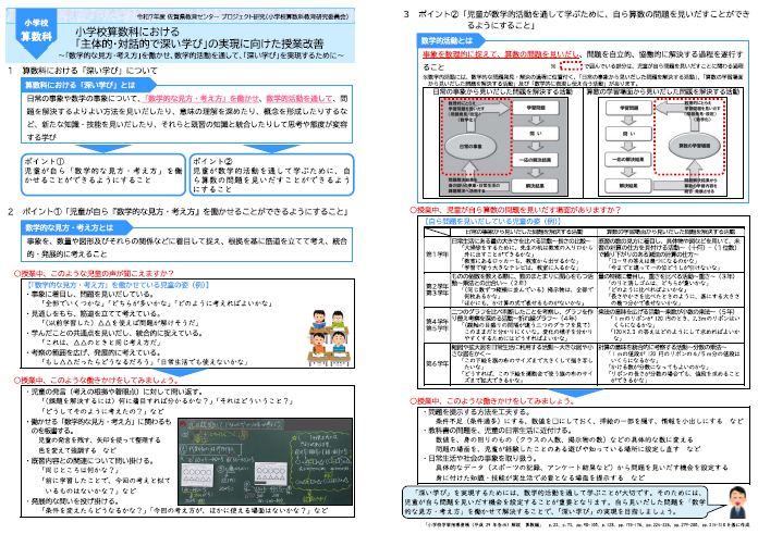 小学校算数科では、令和7年度、児童が、数学的な見方・考え方を働かせ、数学的活動を通して、数学的に考える資質・能力を身に付けることができるようにするために、「深い学び」の実現に向けた授業改善の推進を図るためのコンテンツを開発しました。