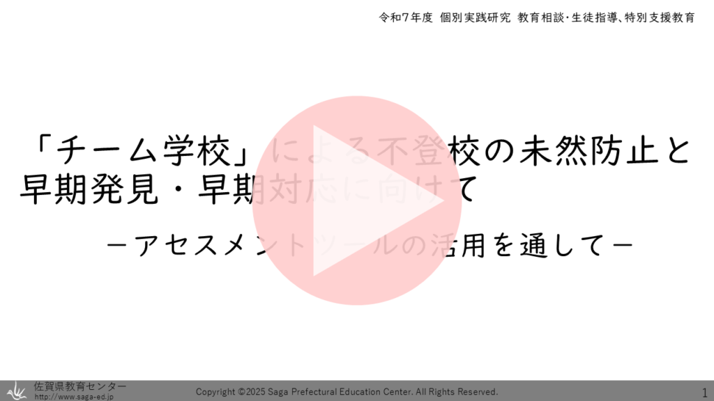 不登校の未然防止と早期発見・早期対応に向けた支援の方法やアセスメントツールの活用方法、活用できる資料等についてまとめた動画です。