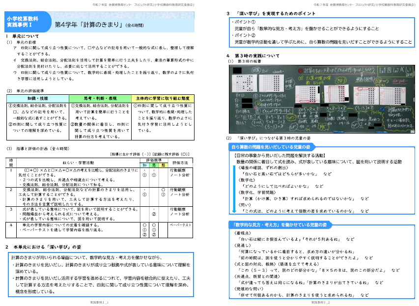 小学校算数科では、令和7年度、児童が、数学的な見方・考え方を働かせ、数学的活動を通して、数学的に考える資質・能力を身に付けることができるようにするために、「深い学び」の実現に向けた授業改善の推進を図るためのコンテンツを開発しました。