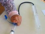 ○児童全員が持っている筒とおし棒に加え、圧し縮めた空気の手応えを感じさせる発展素材として、注射器同士をゴムチューブでつないだものも与えた。 |