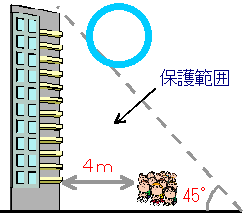 ニューヨークのエンパイアステートビルも屋上の避雷針に落ちずに壁に落ちることもときどきあるようですので、この保護範囲は一応の目安として考えてください。過信は禁物です。確実に安全な場所は、屋外にはないと思っていた方が良いでしょう。