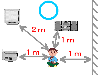 家の中にいれば絶対安全でしょうか。おおむね安全ですが,屋根に落雷してから立っている人に飛び移ることもありますので,姿勢を低くします。鉄筋の建物の中にいれば,雷の電気はコンクリートの中の鉄を伝って地面に逃げますので安全です。ただ,テレビのアンテナや電話回線から雷電流が入って来ることがあります。電話中に死亡した例があります。屋外アンテナにつながるテレビからは2m以上,その他の電気製品からは1m以上離れましょう。また,天井,壁,柱などからも1m以上離れ,部屋の中央部にいます。数字は長い間記憶しておくことは困難ですので,屋内ではできるだけ電気製品から離れ,屋外では高い物から離れ,保護範囲内にいるようにしましょう。