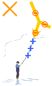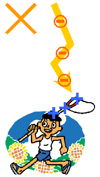 雲の中から飛び出してきた電子は,大地へ向けて移動し,とがった物を目がけて落ちる性質があります。マイナスの電子は,プラスの電気の大地に引かれて移動します。その電子は通りやすい道を通って来るのですが,最後に行き着くところは,地表付近で電子を引き付ける力の大きいところです。どこがプラスの電気が多いでしょうか。とがったところにプラスが集まっています。