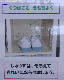 ・靴箱の奥に付けて置くように指導する場合は,「靴箱の奥が,トンと軽く音がするくらいまで中に入れるようにしようね」などと,具体的で分かりやすいように伝えるようにしましょう。