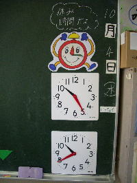 | また,時計係の当番を決め,時刻を掲示させるようにすると,「休み時間は何時までですか?」と聞きに来ていた子どもも,黒板を見ることで安心して行動することができます。休み時間だけでなく,学習中の活動においても「この時刻まで」と意識をもたせることができます。 |