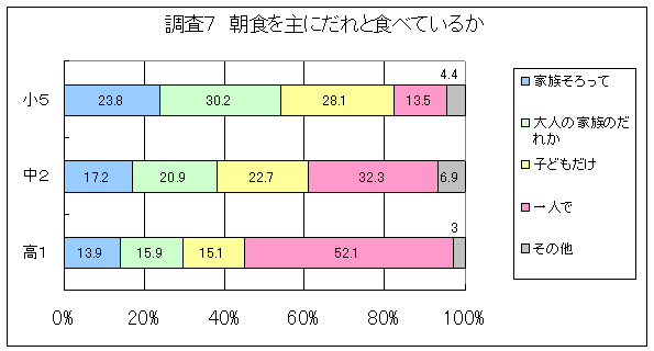 これによると,心身の健康状態は「家族でだれと食事をとっているか」との関連が深く,一人で食事をしたり,子どもだけで食事をしたりする子どもほど,心の健康状態が良くないことが分かります。夕食は「一日の疲れを癒し,明日への活力を得る」重要な働きがあり,特に子どもは,共に食事をすることで日々のストレスを解消していくとも言われています。「朝食をとる子のほうが成績がよい」という結果は,よく知られている事実ですが,共に食事をとることの大切さについても,家庭や社会へ働きかけて広く知らせる必要があります。