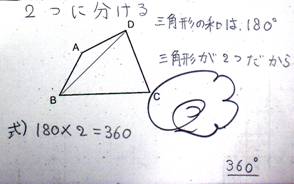 ◎ 三角形の内角の和を基に、四角形の内角の和の求め方を演繹的に考え、説明している。 【数学的な考え方】(観察、ノート) A 四角形を対角線や直線でいくつかの三角形に分けて、三角形のいくつ分かを基に多様な方法で考え、記述している。 B 四角形を対角線で三角形に分けて、三角形の2つ分であることを基に考え、記述している。 〔「努力を要する」状況(C)と判断した児童への指導〕 四角形を対角線で2つの三角形に分けて、三角形の内角の和が180°であることを基に、その2つ分で何度になるか考えさせる。 |