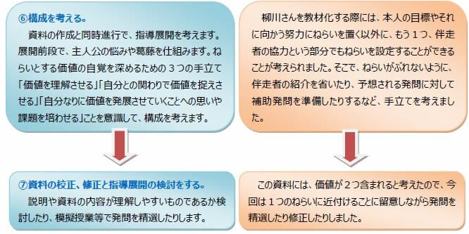 資料4 自作資料を作成する手順例 視聴覚資料等の場合、素材についての情報収集を行った後、大まかな構成を考えてから、取材やインタビューをします。大まかな構成を考える段階で、葛藤場面を取り入れた指導展開を作成します。インタビューの際、その部分を資料化した人物に伝えることで、葛藤場面やねらいとする道徳的価値を意識した資料の作成ができます。 読み物資料の場合は、情報収集を行った後、それらの事実を基に読み物資料を作成します。この段階で、葛藤場面を意識しながら資料を作成することになります。その後の取材やインタビューで作成した資料は、あくまで補助資料となります。取材の中で、本人に読み物資料や指導展開を確認してもらい、必要な補助資料の準備を行います。 実践授業1と2の自作資料作成の実際を次に紹介します。 |