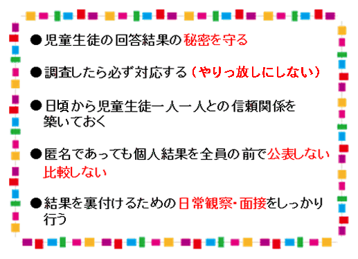 | 「がばいシート」を実施する際には、児童生徒の実施への不安をできるだけ小さくすることが大切です。以下は、実施する際の留意点を示します。 | |||
