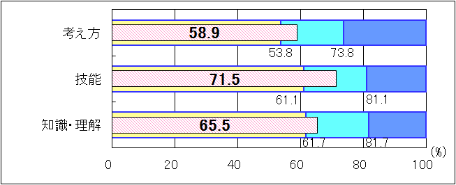 「考え方」「技能」では、「おおむね達成」の基準を上回り、「知識・理解」では、「十分達成」の到達基準82.1を0.6ポイント上回った。「考え方」における