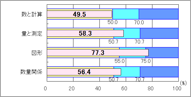 「量と測定」「数量関係」においては、「おおむね達成」の基準を上回り、「図形」では、「十分達成」の到達基準75.0を2.3ポイント上回る結果であった。しかし、「数と計算」においては、「おおむね達成」の到達基準50.0を0.5ポイント下回る結果となった。「数と計算」における課題として、次のことが挙げられる。