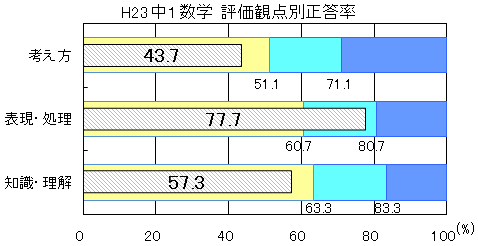 「表現・処理」の観点では、「おおむね達成」の基準を上回った。一方、「考え方」「知識・理解」の観点では、「おおむね達成」の基準を下回った。